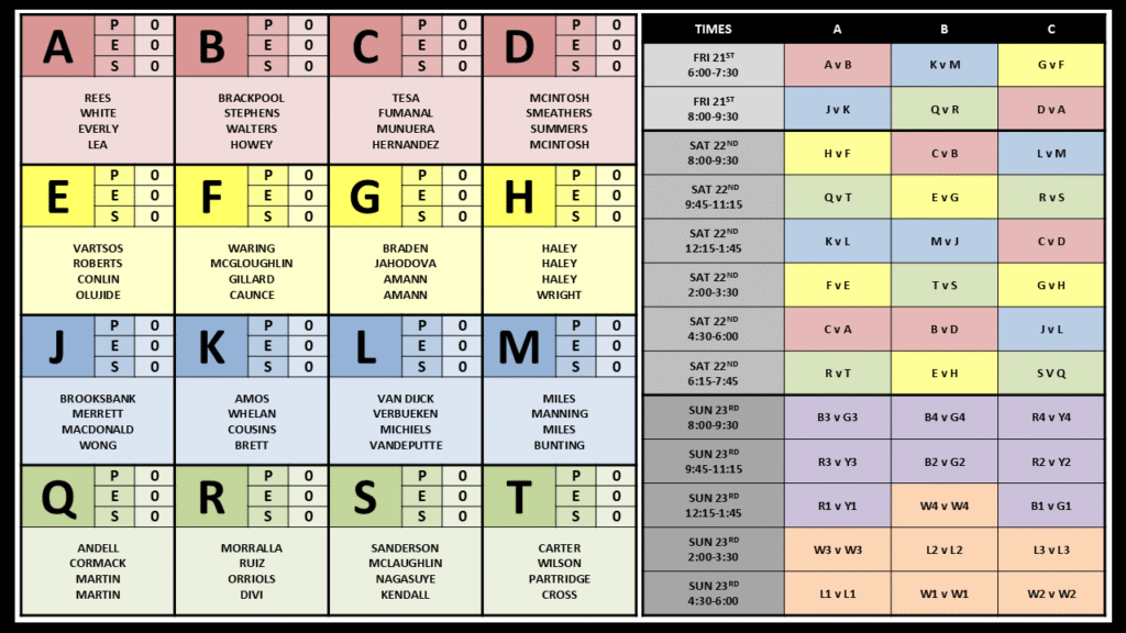 In the group stage there are 4 coloured groups with 4 teams in each. During the Friday and Saturday sessions, each team will play the other three teams in their group. The playoffs will begin Sunday morning with teams from each group playing against a team of the same rank from another group (Red v Yellow and Blue v Green). A second playoff round follows in the afternoon, where the top 14 teams will play one last game (Red/Yellow v Blue/Green) to decide the final rankings. Teams who lose the rank 4 v rank 4 games will be ranked 15th or 16th based on their points, ends, and shots scored in the group stage only. The final draw will finish at approximately 6pm on Sunday which will be followed by a brief trophy presentation.